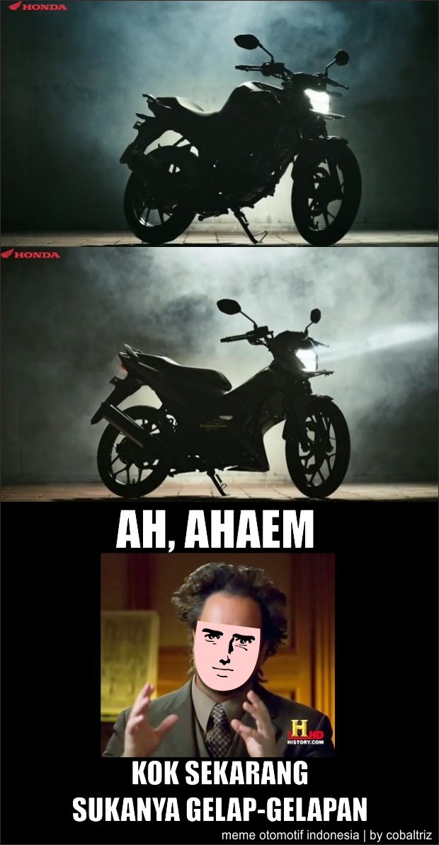 Coba, masak iklannya main gelap-gelapan semua? Aduduh, main gelap-gelapan kan gak baik, bisa mengundang bisikan syethannn.. Sonic150 gelap-gelapan, CB150R facelift juga gelap-gelapan.. Waduh, nanti kalo motornya dipake gelap-gelapan begimana? Apalagi jika sonic sudah berbekal ban cacing dan jok licin untuk mengundang para penjaja lombok di pinggir jalan? Set dahhh..