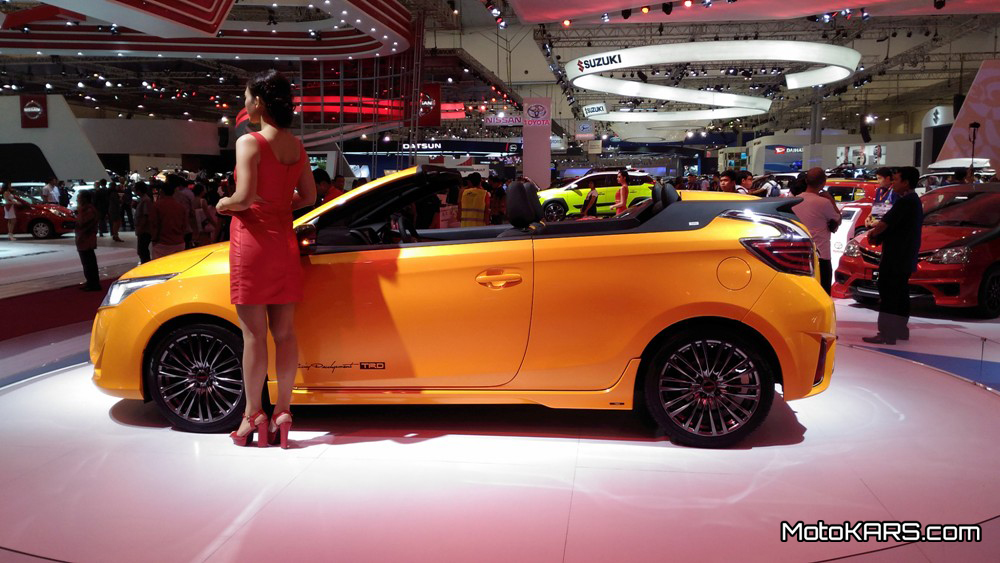 Bila pembaca sudah masuk di Hall 10 yang bisa pembaca jumpai kedua konsep Yaris ini. Toyota menghadirkan nuansa berbeda di mobil andalannya untuk orang berjiwa muda. Pertama adalah Toyota Yaris Legian, secara nama mungkin sudah tahu inspirasinya dari mana. Ini adalah mobil yang terinspirasi dari sebuah daerah di Bali yaitu Legian. Tampilannya berupa cabriolet dengan warna yang meriah cerah serta tampil agresif tanpa kumis lele, malah mirip semi-semi grille ala Lexus. Apa bisa ditutup atapnya? sepertinya gak bisa… memang ini yaris “tanpa atap”.