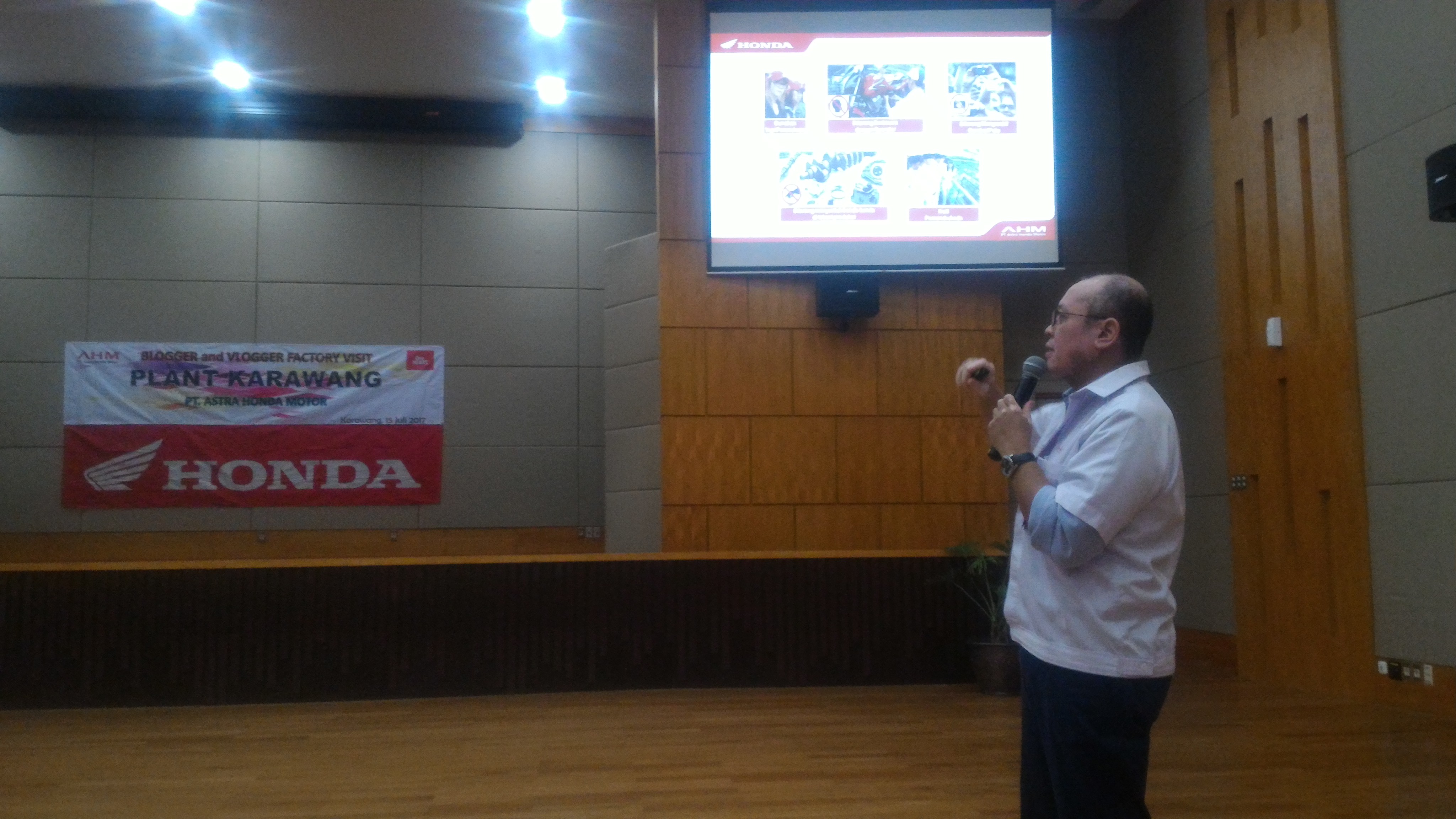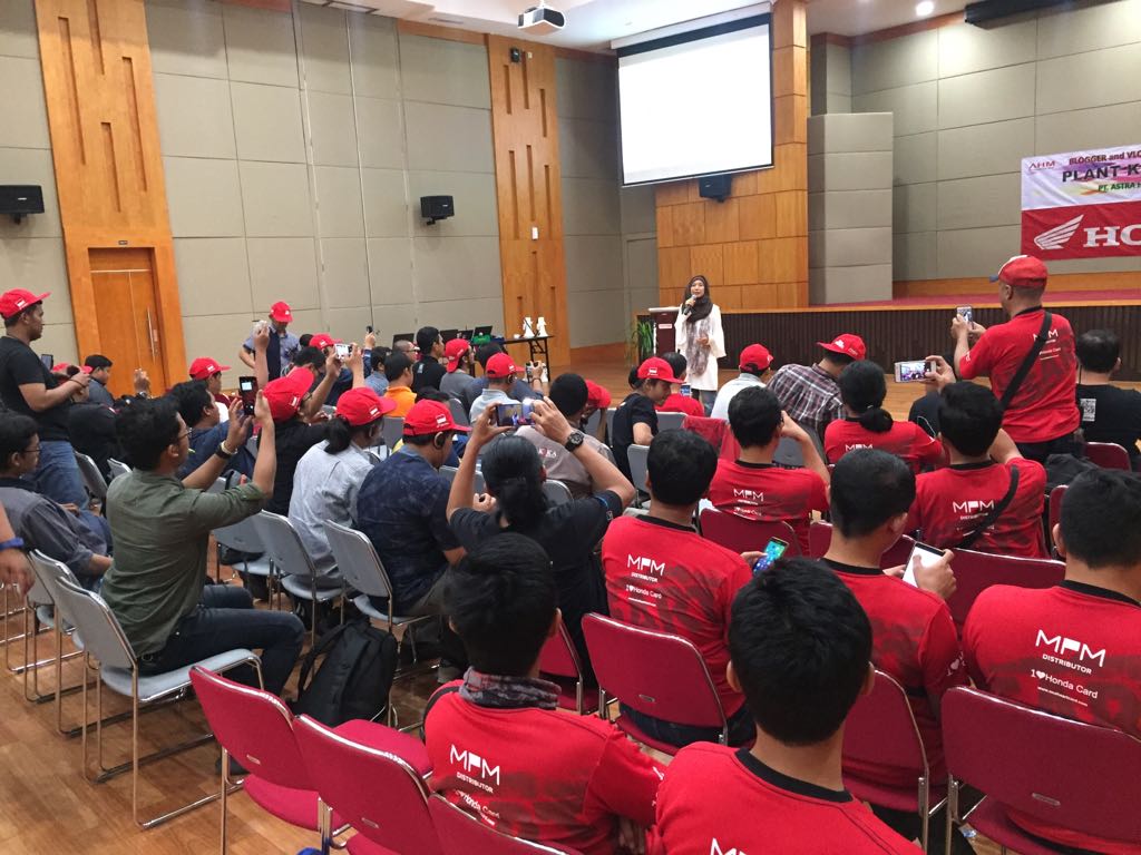 So apa yang kita lakukan disini, dalam event ini AHM ingin mengajak para blogger dan vlogger untuk melihat proses pembuatan motor honda mulai yang menjadi tulang punggung mereka seperti Vario dan Beat hingga flagship mereka seperti CBR250RR. Blogger dan Vlogger pertama diedukasi oleh Ibu Istiyani Susriyati dengan model tiga layer marketing Honda. Apa saja itu? pertama adalah Honda Big Wing yang melayani konsumen yang menginginkan moge 500 cc keatas Honda. Kedua adalah Honda Wing yang melayani konsumen yang menginginkan motor premium Honda seperti CBR250RR, CRF250 Rally, PCX dan SH150i. Ketiga adalah regular yang melayani konsumen motor Honda pada umumnya yang dirakit disini.