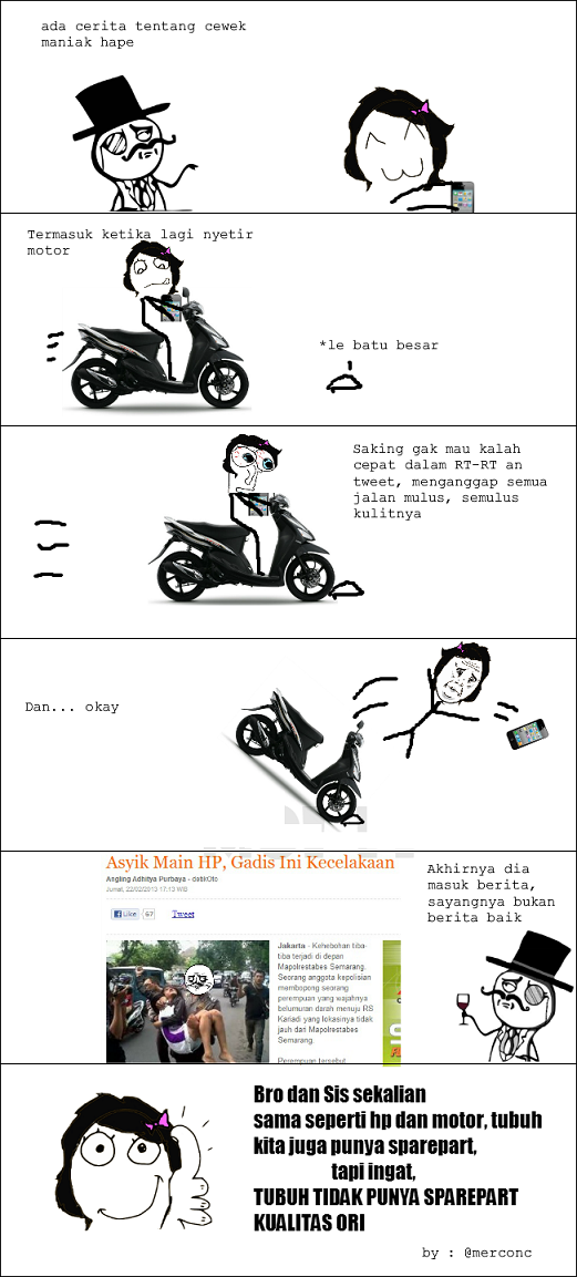 Main hape sambil berkendara? merasa hebat kah? apalagi yang menggunakan Smartphone Android sambil berkendara, seolah apa yang sedang dilakukan itu sangat penting, wah… ini… konyol namanya, lebih konyol lagi kalo mati konyol karena sesuatu yang gak penting, seolah tidak punya tempat dan waktu untuk menggunakan hape.