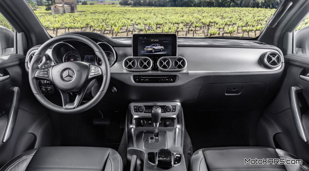 Menilik dari segi interior, jangan membayangkan bahwa kemewahan interior sedan Mercedes-Benz akan tertular di interior X-Class ini. Yah tertular tapi porsinya gak banyak, sebab sudut-sudut basis awal mobil ini masih tertinggal dengan jelas. Setidaknya model seperti kisi-kisi AC model baling seperti Mercedes juga tersemat di X-Class. Hal yang tertinggal jelas di Navara adalah perpindahan gigi, sistem 4×4, kaca dan pengatur suhu. Tapi Mercedes membekali X-Class dengan fitur mewah seperti sistem konektivitas COMMAND 8,4 inchi, dashboard kulit dan instrument cluster yang tidak berbeda jauh dengan C-Class.